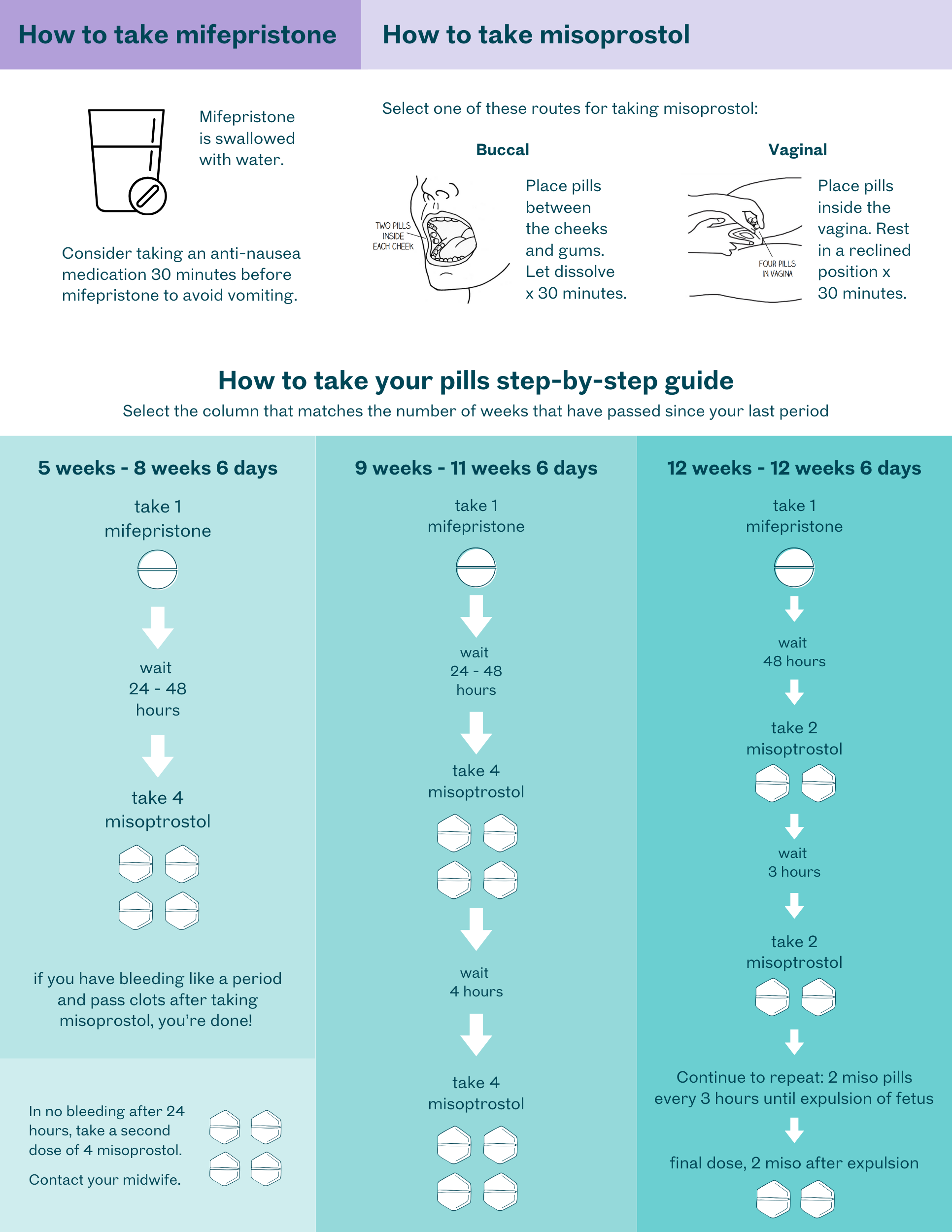 Se utilizan otras instrucciones de dosificación para tomar la medicación abortiva en la semana 12. Si cree que está en la semana 12, póngase en contacto con su matrona para recibir instrucciones y apoyo.